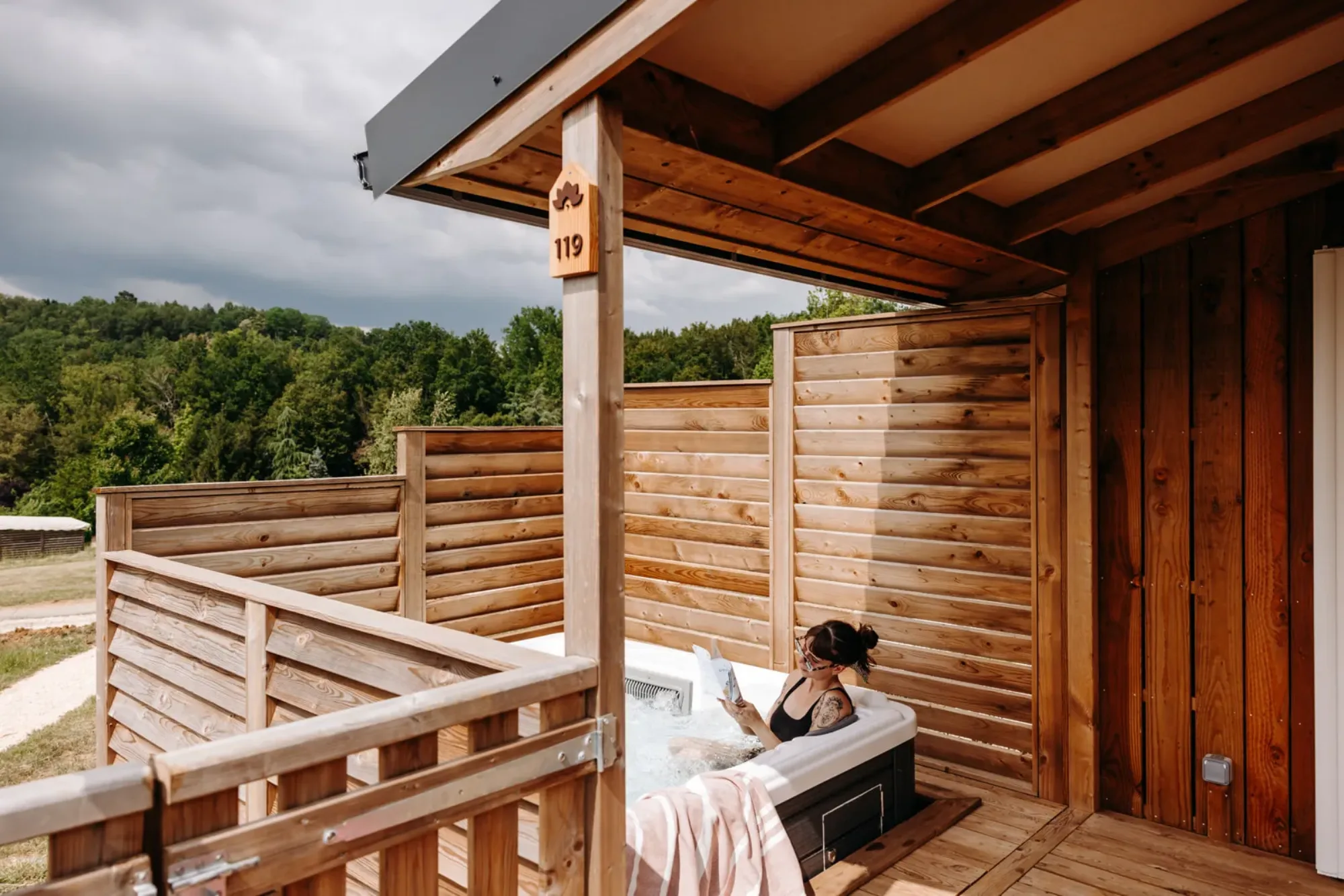 En parfaite harmonie avec la nature, nos cabanes signature sont ouvertes vers l’extérieur grâce à leur grande baie vitrée panoramique et leur terrasse avec vue.