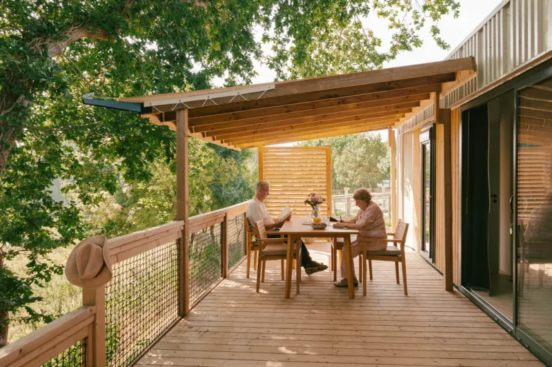 Die geräumigen und funktionalen Familiencottages erweitern dank ihrer Holzterrassen den Lebensraum nach draußen. Hier kann man im Freien frühstücken, den Kindern nach dem Mittagsschlaf beim Spielen zusehen und bei Einbruch der Dunkelheit ein gemütliches Abendessen genießen.