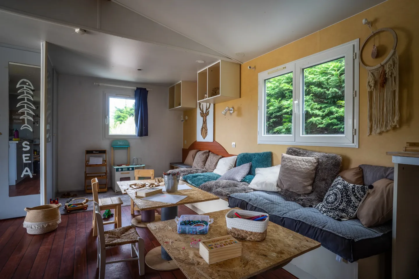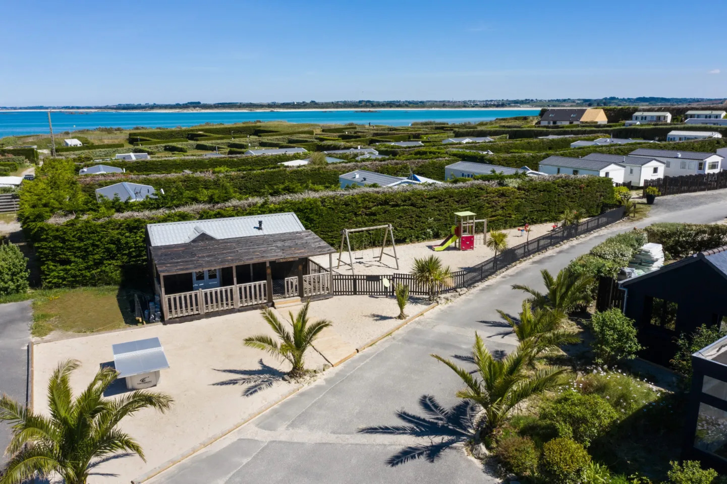 Diese wahre Oase aus bläulich schimmerndem Holz hat sich mitten auf unserem Anwesen niedergelassen. Nur einen Steinwurf vom Rauschen der Wellen entfernt, ist dieser ungewöhnliche Ort der geheime Ausgangspunkt unserer Gemeinschaft auf dem Weg zur Côte des Légendes. Hier, mit den Füßen im Sand, lernen wir, den Anker zu lichten und die Kunst des Entschleunigens zu pflegen, um vollkommen abzuschalten.