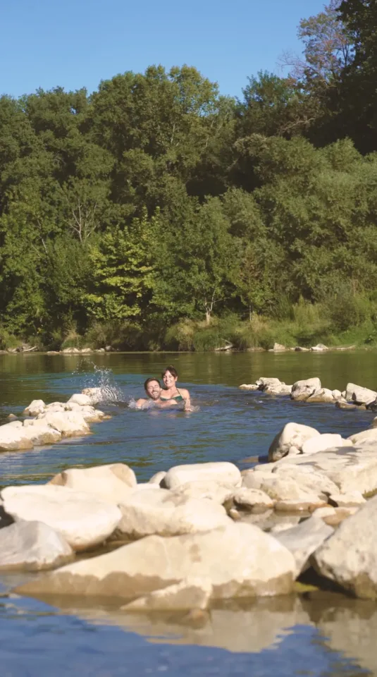 Autour de notre camping à La Roque-sur-Cèze, la nature s’invite à chaque instant. En contrebas, la rivière Cèze déroule ses eaux claires entre les rochers dorés et les chênes verts. On y descend à pied depuis le Slow Village pour une baignade rafraîchissante, une sieste sur la plage naturelle ou un moment de calme les pieds dans l’eau. Les enfants y jouent, les grands s’y ressourcent : chacun trouve son rythme, au fil de la rivière.