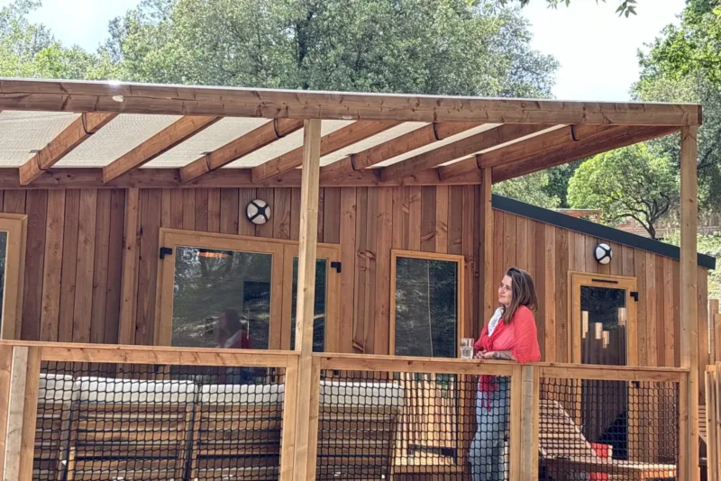 Au cœur du Slow Village Provence Occitanie, les hébergements sont installés entre chênes verts, garrigues et senteurs de thym. Le bois clair des cottages dialogue avec la pierre dorée du village, et la vallée de la Cèze s’étire en contrebas. Chez nous, on vit dehors : on prend le petit-déjeuner sur la terrasse, on écoute les cigales s’endormir, on regarde le ciel s’embraser chaque soir au-dessus des collines du Gard.