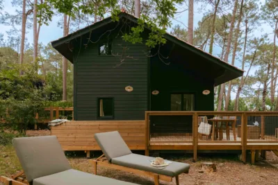 Notre Cabane Confort 2 chambres, au coeur de la pinède, vous attend pour un séjour typique et tranquille dans les Landes.