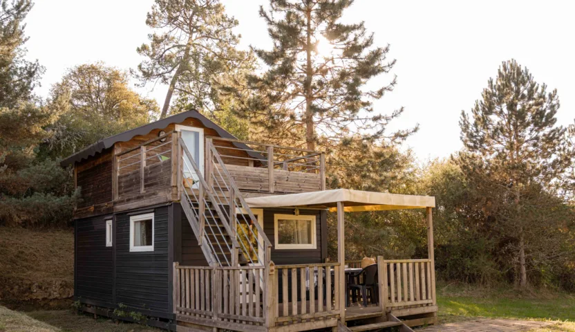 Découvrez notre cabane premium 2 chambres en bois haut de gamme et tout équipé. L’hébergement idéal pour vos vacances dans cet écrin de verdure périgourdin !