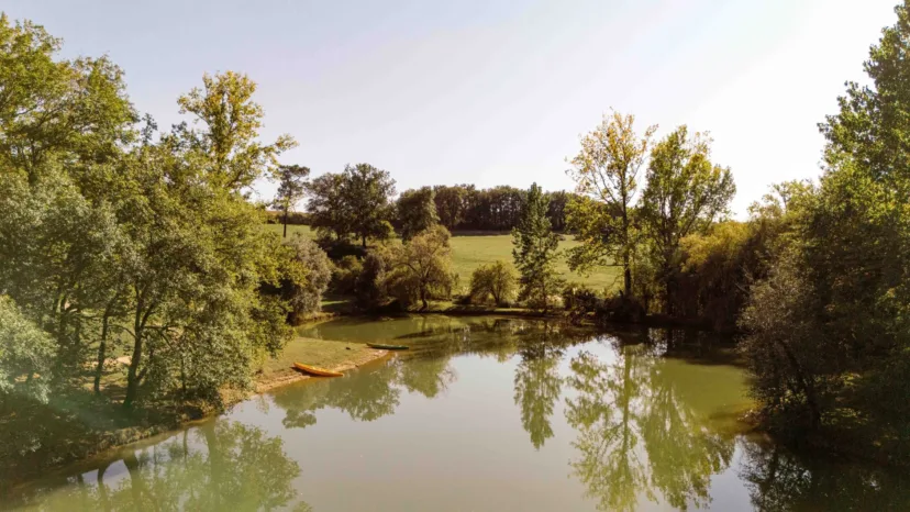 Een groot natuurlijk zwembad van 3000 m² in een groene omgeving is de belofte van een natuurlijke duik op het eiland van het kasteel, gratis voor onze gasten.